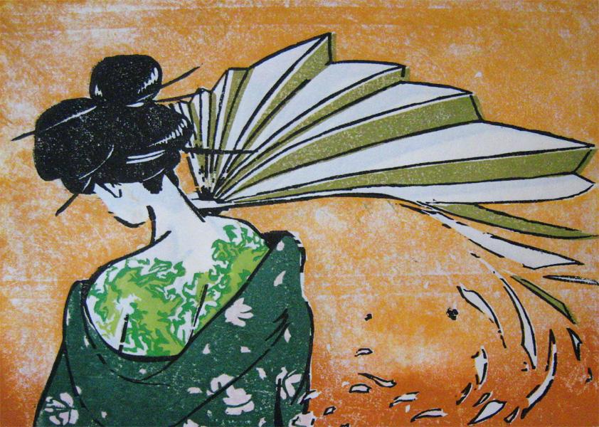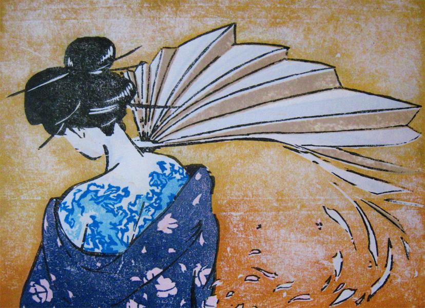 Works include drawings (charcoal, conte crayon, pastel), paintings (oil, acrylic), and prints (ukiyo-e style woodblock, pronto plate lithograph, traditional limestone lithograph).